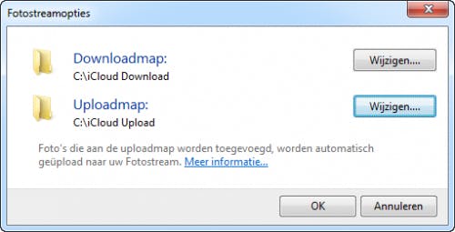 Vinkt u Fotostream aan, dan verschijnen de foto's die u met uw iPhone of iPad maakt voortaan automatisch op uw pc. Erg handig, want dan hoeft u ze niet meer handmatig over te zetten. Klik op Opties en geef bij Downloadmap aan in welke map de fotobestanden opgeslagen moeten worden. Het leuke is dat u op dezelfde manier foto's van de computer kunt oversturen naar uw mobiele gadgets. Hiertoe geeft u een mapnaam op bij Uploadmap. Foto's die u daar neerzet, verschijnen even later op uw iPhone en/of iPad. Klik tot slot op Toepassen. Voordat het synchroniseren start, moet u nog aangeven welke contacten, afspraken en taken met iCloud samengevoegd mogen worden. Die komen vervolgens in Outlook in een nieuwe agenda en contactlijst onder het kopje iCloud te staan. De gemaakte instellingen zijn later nog aan te passen via het iCloud-pictogram in het systeemvak, of via Start / Configuratiescherm / Netwerk en internet / iCloud. Het is overigens verstandig in Outlook een back-up van contacten en afspraken te maken voordat u synchronisatie inschakelt.