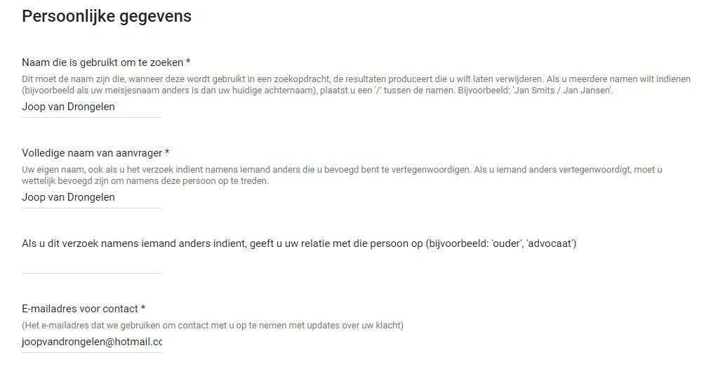 In de volgende velden vul je je naam in, en de naam waarvan je wil dat de zoekresultaten niet meer verschijnen. Let op: Het emailveld hoeft niet persé een Gmail-adres te zijn.