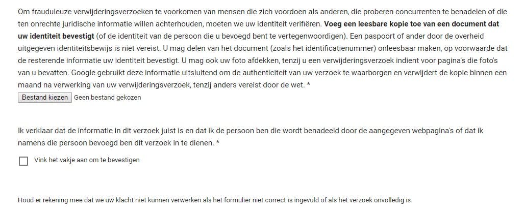 In dit veld moet je bewijzen dat je zelf het verwijderverzoek indient. Je moet daarom je identiteit bevestigen. Let wel op: Dat hoeft niet een identiteitsbewijs of paspoort te zijn. Het mag ook een pas van bijvoorbeeld de sportclub zijn, als er maar een naam op staat.