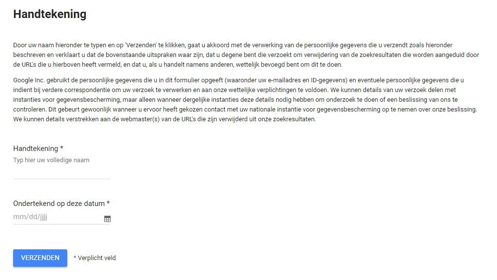Onderteken je bericht met je naam en handtekening en druk op 'Verzenden'. Google neemt je verzoek in behandeling en komt daar binnen 4 weken op terug.