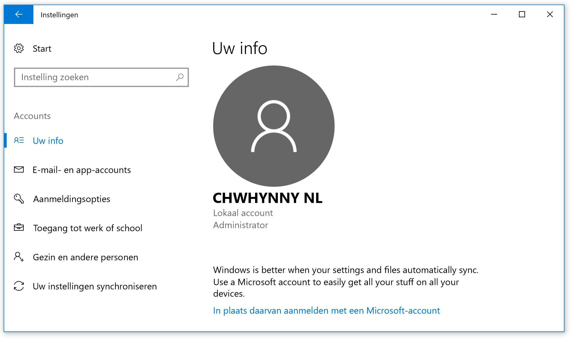 Om te controleren of je account echt een lokaal account is, moet je even teruggaan naar Instellingen > Accounts > Uw info. Onder de naam van je gebruikersaccount zul je als het goed is Lokaal account zien staan.
