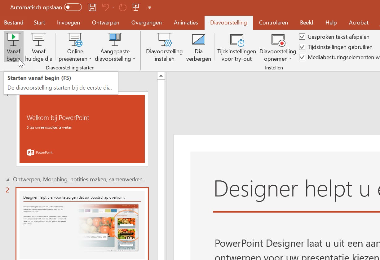 De functie om je muis te gebruiken als laserpointer zit in PowerPoint ingebouwd (dus niet in Windows. In Windows zelf kun je tegenwoordig de Ctrl-toets indrukken voordat je klikt, zodat de muisaanwijzer extra aandacht vraagt. Dat werkt óók in PowerPoint, en in dit geval werkt het wat verwarrend: ze gebruiken dezelfde activatietoets. We komen hier zo nog op terug. Er zijn twee modi in PowerPoint waarin de laserpointer-functie werkt. Om te kunnen werken met de laser, klik je op de knop Vanaf het begin of Vanaf huidige dia om te beginnen met het afspelen van je voorstelling. In het venster dat dan geopend wordt, zal je laserpointer werken. Een alternatieve weergave is de Leesweergave. Om deze te activeren klik je op het tabblad Beeld in het lint en daarna op Leesweergave.