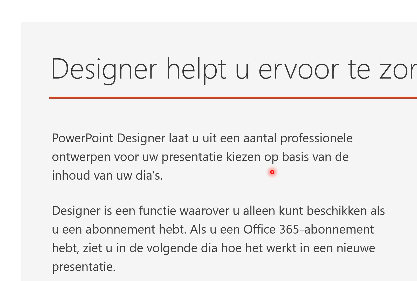 Je bent nu klaar om met je laserpointer te gaan werken. Hiervoor houd je de Ctrl-toets ingedrukt, houd vervolgens de linkermuisknop ingedrukt en verplaats je muis. Je ziet nu je muisaanwijzer plaatsmaken voor de laserpointer. Belangrijk: zorg dat je muis nog steeds beweegt wanneer je de Ctrl-toets weer loslaat. Je activeert anders die muisfocus-functie van Windows 10 waar we het net over hadden. En je wilt juist niet dat je aandacht vraagt voor je muisaanwijzer op het moment dat je klaar bent met iets aanwijzen met de laserpointer.