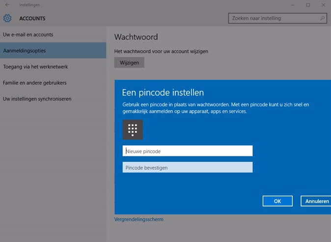 Heb je helemaal geen zin om een wachtwoord in te toetsen en vind je het fijn om, net als op je smartphone, met een pincode in te loggen, dan is dat ook mogelijk in Windows 10. Hiervoor klik je op de knop Start, vervolgens op je profielfoto en daarna op Accountinstellingen wijzigen. Klik op het tabblad Aanmeldingsopties en vervolgens op Toevoegen onder Pincode. Je dient nu nog één keer in te loggen met het wachtwoord van je Microsoft-account en vervolgens kun je de pincode kiezen die je graag wilt gebruiken. Dit is niet beperkt tot vier cijfers, je kunt het veel langer maken, maar vergeet niet dat het wel een pincode moet zijn die je zelf kunt onthouden.