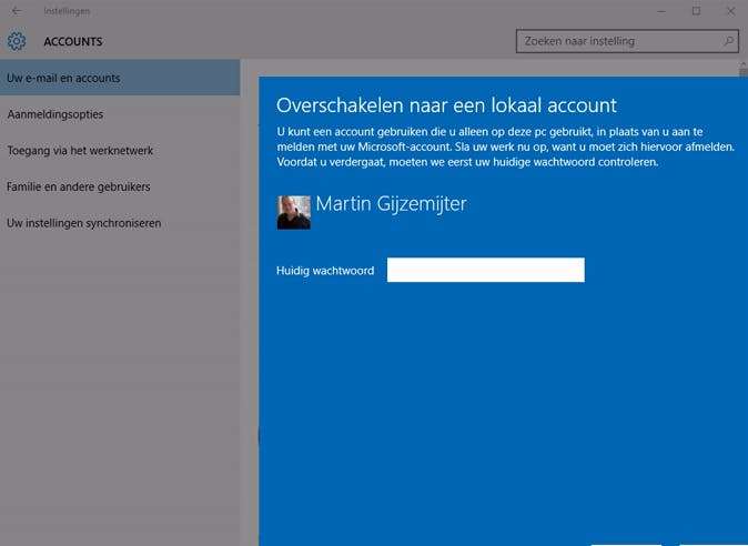 Het is ook mogelijk om in te loggen met een lokaal account. Onthoud wel dat je dan een aantal privileges kwijtraakt, zoals de ingebouwde synchronisatie met OneDrive en dat je elke keer als je iets koopt uit de Windows Store je handmatig je wachtwoord in moet vullen. Als je dat geen probleem vindt, dan is het loskoppelen van je Windows-account zo gepiept. Klik wederom op Start, je profielfoto en daarna op Accountinstellingen wijzigen. Klik op Uw e-mail en accounts en onderin het venster op In plaats daarvan aanmelden met een lokaal account. Je dient dan nog eenmalig je Microsoft-wachtwoord in te vullen, waarna je uitlogt en met een lokaal wachtwoord weer kunt inloggen.