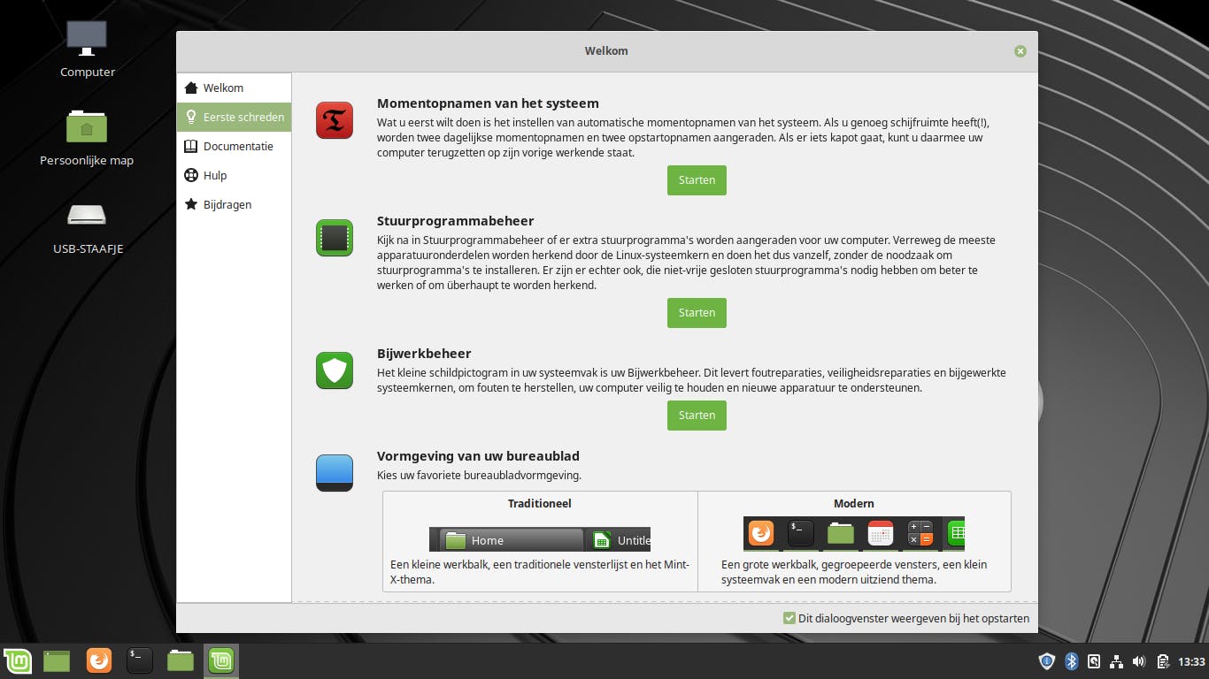 Na afloop van de installatie kom je vanzelf weer in de liveomgeving terecht. Klik op Nu herstarten. Typ het ingestelde wachtwoord in en druk op Enter. Vervolgens duurt het even voordat het Nederlandstalige welkomstvenster zich laat zien. Via Eerste schreden bekijk je onder meer hoe je momentopnamen (herstelpunten) kunt maken en op welke wijze je stuurprogramma’s kunt installeren en lees je hoe je Linux Mint kunt bijwerken. Tot slot gebruik je het onderdeel Programmabeheer om interessante software te installeren.