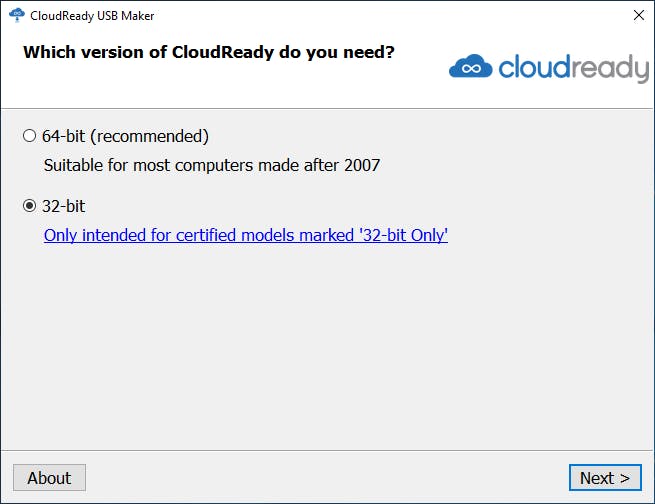 Doe de usb-stick nu eerst in de computer. Via Next kun je tussen een 32bit- of 64bit-versie kiezen. Belangrijk is dat je de juiste optie selecteert, dus controleer zo nodig de architectuur van de machine waarmee je CloudReady wilt gebruiken. Aangezien we het besturingssysteem op een oud systeem gaan installeren, kiezen we in deze workshop voor 32 bit. Klik wederom tweemaal op Next en selecteer de juiste usb-opslagdrager. Via Next downloadt het programma de image en creëert het vervolgens een opstartbare usb-stick. Dat duurt ongeveer twintig minuten. Sluit als laatste af met Finish.