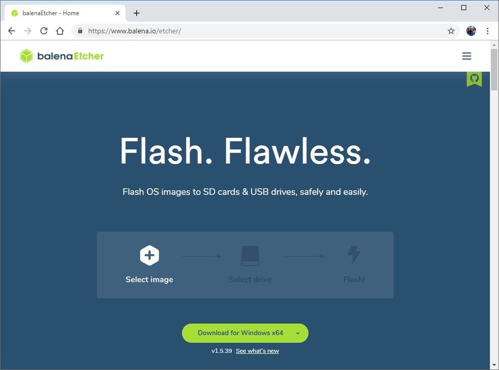 Net zoals CloudReady installeer je Linux Mint eveneens vanaf een opstartbaar opslagmedium. Je kunt het zojuist gedownloade iso-bestand bijvoorbeeld op een dvd branden. Maar omdat niet iedere machine meer een cd/dvd-station aan boord heeft, creëren we aan de hand van het gratis programma Etcher een opstartbare usb-stick. Dit tooltje is voor Windows, macOS en Linux beschikbaar. Surf naar balena.io en klik op de groene downloadknop om het installatiebestand binnen te halen. Zodra je de installatie hebt uitgevoerd, verschijnt er een bescheiden dialoogvenster in beeld.