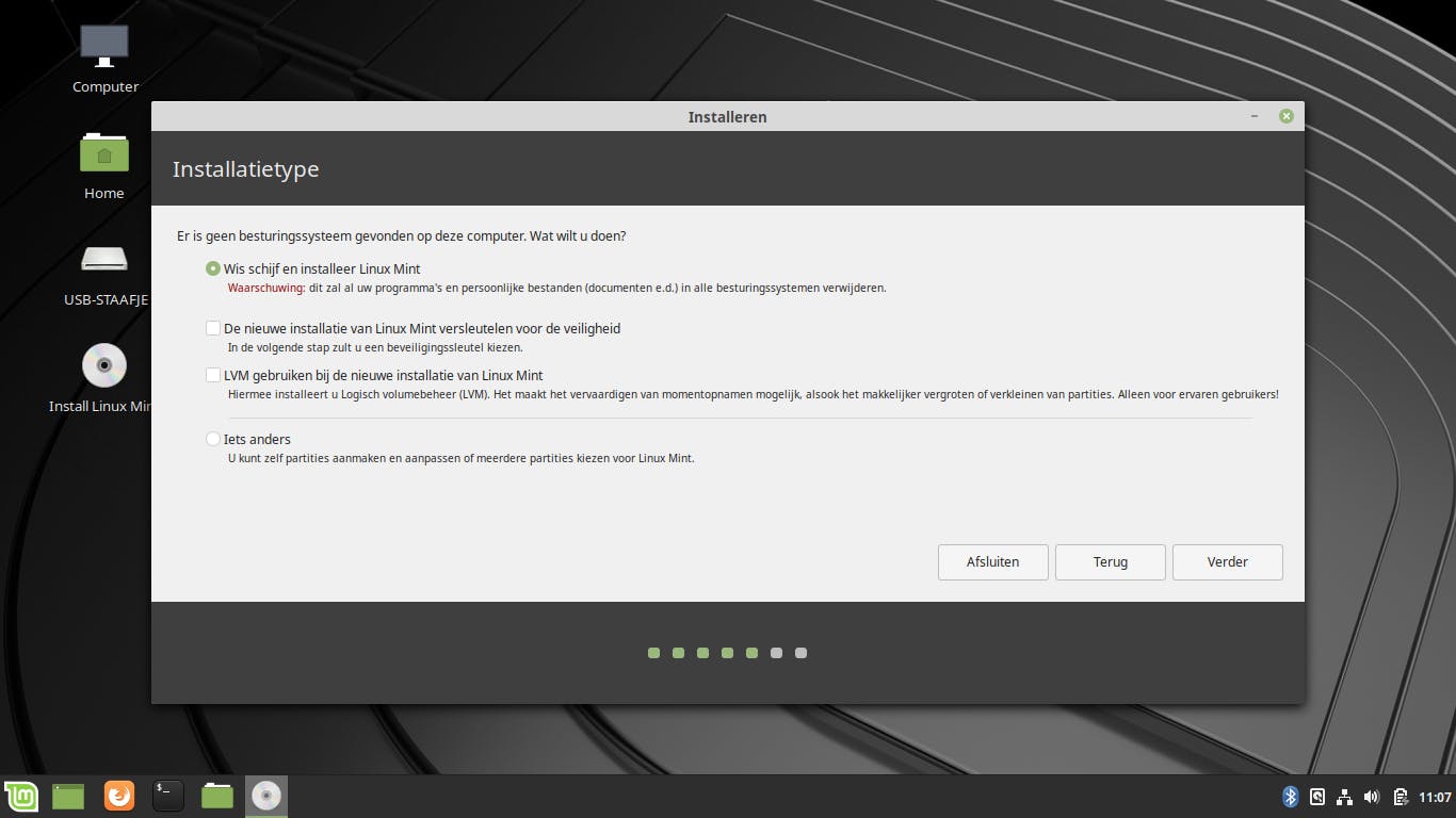 Voor de installatie van Linux Mint op je computer heb je keuze uit verschillende mogelijkheden. De optie Wis schijf en installeer Linux Mint is een goede keuze wanneer je enkel Linux Mint op de machine wilt gebruiken. Als er nog een (oude) Windows-versie op het systeem staat, kun je als alternatief de optie Installeer Linux Mint naast Windows selecteren. Daarmee creëer je een zogeheten dualboot-systeem. Maak een keuze en klik op Verder. Bepaal vervolgens op welke schijf je Linux Mint gaat installeren en bevestig met Installeer nu.