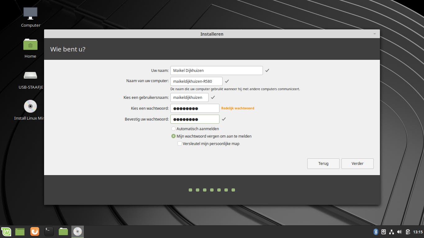 Tijdens de installatie wil Linux Mint je huidige locatie weten. Voor gebruikers uit Nederland staat Amsterdam al ingevuld, maar je kunt ook een andere stad typen. Vervolgens wordt er gevraagd om accountgegevens. Voor dit besturingssysteem heb je namelijk altijd een gebruikersaccount nodig. Via Verder vul je om die reden een naam, computernaam en gebruikersnaam in. Voor de gebruikersnaam mag je uitsluitend kleine karakters gebruiken. Typ ook tweemaal het wachtwoord in en bepaal of je je in het vervolg automatisch wilt aanmelden. Je vinkt vrijblijvend de optie Versleutel mijn persoonlijke map aan, zodat je bestanden extra zijn beveiligd. Klik op Verder en wacht de installatieprocedure af.