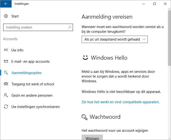 De instellingen voor Hello en de manier waarop je je op je computer kunt aanmelden, vind je bij Instellingen, Accounts en vervolgens Aanmeldingsopties.