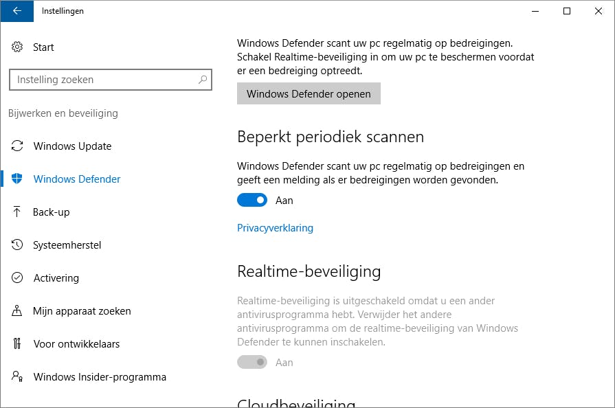 In de vorige versies van Windows 10 was het niet mogelijk om Microsoft's ingebouwde scanprogramma Defender te gebruiken als je al een virusscanner hebt geïnstalleerd. Sinds de Anniversary Update is het echter mogelijk om Defender naast je bestaande antiviruspakket te gebruiken. Windows Defender kan dan als een 'second opinion' dienen, maar je kunt dan alleen een handmatige of periodieke scan van je systeem uitvoeren. Windows Defender zal dus niet - om je systeem niet al te veel te vertragen - zorgen voor realtime-beveiliging van je computer, want Microsoft gaat er dan vanuit dat de door jou geïnstalleerde virusscanner dat doet.