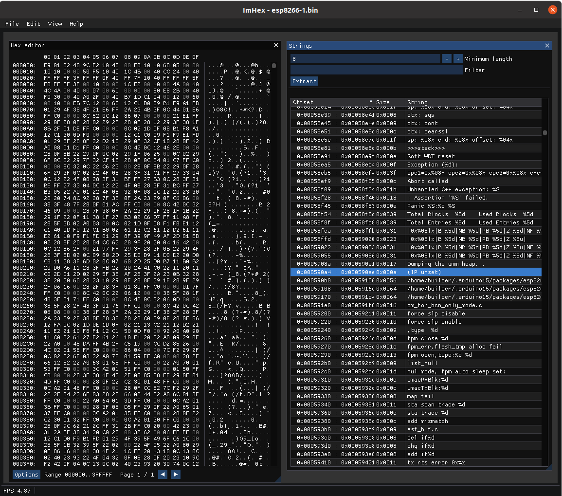 Je hebt nu een kopie van de firmware die op je ESP8266 draait en deze kun je verder op je computer analyseren. Als je op een Linux-computer werkt, is de tool strings meestal standaard geïnstalleerd (onderdeel van het pakket binutils): die toont je alle leesbare tekenreeksen in een binair bestand. In Windows maakt een gelijknamig en bijna identiek programmaonderdeel uit van Windows Sysinternals.