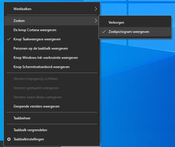 Wil je helemaal geen zoekknop op je taakbalk? Dan kun je deze in Windows 10 ook helemaal uitschakelen. Dat doe je als volgt: klik met de rechtermuisknopop de taakbalk en kies voor de optie Zoekenen klik vervolgens op Verbergen. De zoekfunctie verdwijnt vervolgens in zijn geheel uit het startmenu. Toch spijt van je keuze? Dan zet je in hetzelfde menu-onderdeel een vinkje bij Zoekpictogram weergeven.