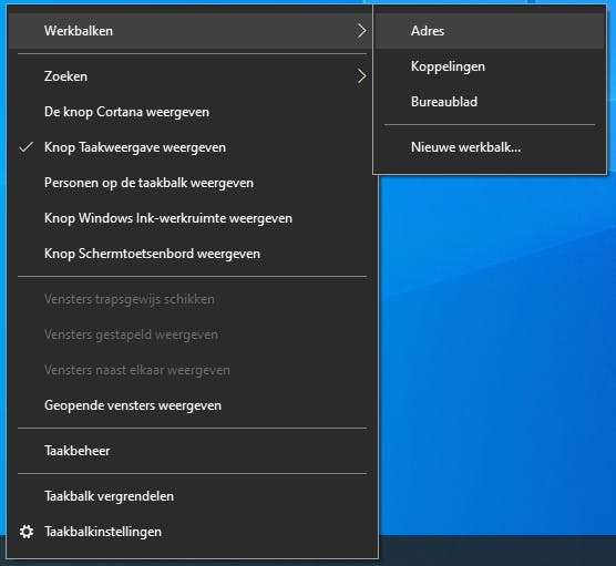 Heb je geen zin om telkens eerst een browserscherm te openen om vervolgens een website-adres in te typen? Gebruik dan de adresbalk in de taakbalk. Om dit in te schakelen klik je met de rechtermuisknop op de taakbalk, en kies voor Werkbalkenen vervolgens voor Adres. Een adresbalk verschijnt vervolgens op de taakbalk. Een url intypen gevolgd door Enteropent de opgegeven website in je als favoriet ingestelde browser.