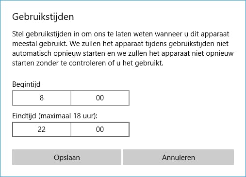 Druk op Windows-toets+I en kies Bijwerken en beveiliging / Windows Update / Gebruikstijden wijzigen / Wijzigen. Stel een Begintijd en een Eindtijd in (met een maximaal verschil van 18 uur) waarbinnen je geen automatische herstart wilt. Bevestig met OK.