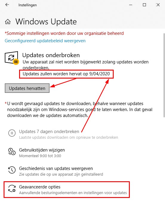 Updates laten zich ook uitstellen. Het volstaat dat je in hetzelfde dialoogvenster op Updates 7 dagen onderbreken klikt. Iedere keer dat je hierop klikt, komt er een week uitstel bij, tot maximaal 35 dagen. Bovenaan lees je af wanneer het updateproces weer hervat zal worden. Windows Pro-gebruikers kunnen via Geavanceerde opties ook onderdelen- en kwaliteitsupdates uitstellen, tot respectievelijk 365 en 30 dagen.