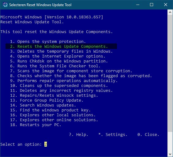 Je kunt het ook proberen met de Reset Windows Update Tool van Microsoft. Na het uitpakken van het zip-bestand voer je als administrator het exe-bestand uit dat bij je Windows-versie past (x64 voor 64 bit of x86 voor 32 bit). Kies de gewenste taal (0 voor English), bevestig met Y en selecteer 2 Resets the Windows Update Components.