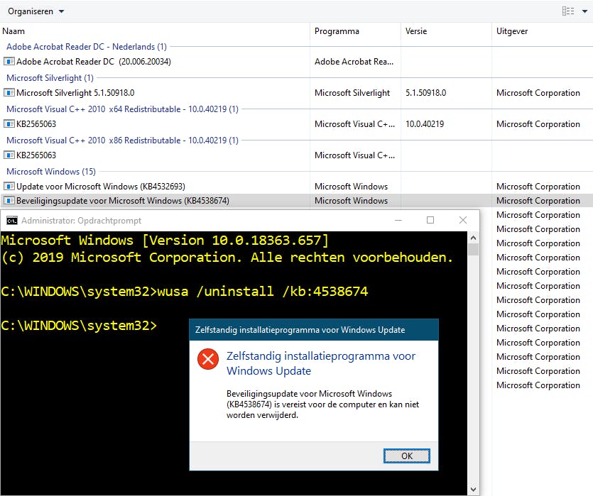 Verschijnt Verwijderen niet en wil je die update absoluut weghalen, probeer het dan als volgt. Noteer het KB-nummer uit de lijst (Knowledge Base), klik vervolgens met rechts op Opdrachtprompt in het Windows-startmenu en kies Als administrator uitvoeren. Voer daarna het volgende commando uit: wusa /uninstall /kb:<id> (bijvoorbeeld wusa /uninstall /kb:4538675). Succes is echter niet gegarandeerd en je voert zo’n commando in elk geval op eigen risico uit.