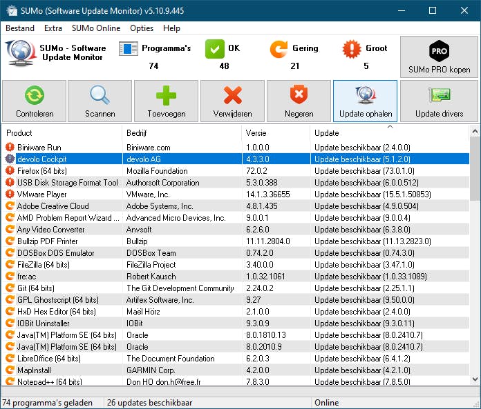 Een tool die op onze testsystemen steevast van een indrukwekkend aantal programma’s kan aangeven of die aan een update toe zijn, is SUMo Lite (ook portable). Deze versie is gratis en laat jammer genoeg geen volautomatische downloads en installaties van programma’s toe. Wil je dat wél, dan kun je de Pro-versie voor circa vijftien euro aanschaffen.