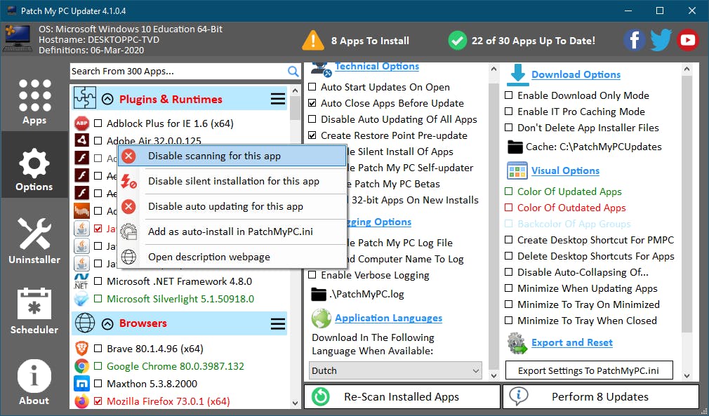 Heb je alles naar wens ingesteld, dan zorg je er met de knop Perform x Updates voor dat alle herkende en verouderde applicaties geüpdatet worden. Houd je een bepaalde toepassing voortaan liever buiten die updates, klik dan met rechts op de naam van die applicatie en kies Disable scanning for this app.