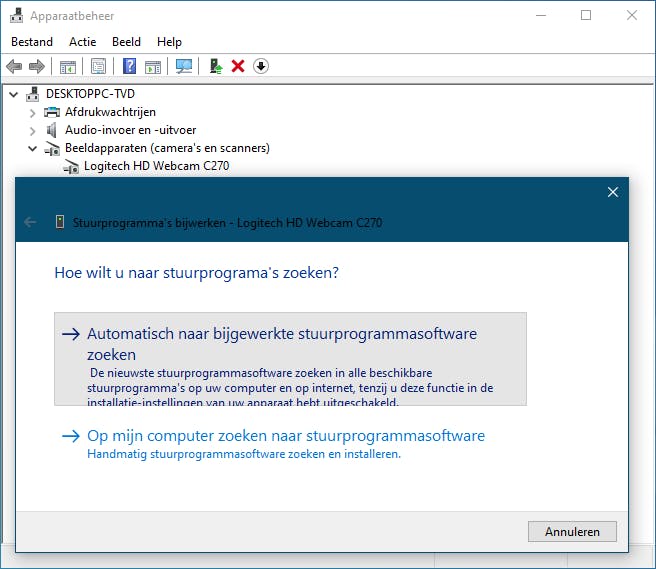 Een handmatige download van de site van de fabrikant is een beter idee. Druk hiervoor op Windows-toets+R, tik devmgmt.msc in en druk op Enter. Het Windows Apparaatbeheer duikt op. Rechtsklik op het beoogde stuurprogramma en kies Stuurprogramma bijwerken. Heb je de juiste driver intussen al van de site van de fabrikant gedownload, kies dan Op mijn computer zoeken naar stuurprogrammasoftware, waarna je verwijst naar het juiste driver-bestand. In het andere geval laat je Windows zelf zoeken naar een geschikte update via Automatisch naar bijgewerkte stuurprogrammasoftware zoeken.