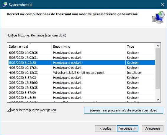 Het updaten van je systeem of van een driver kan altijd weleens fout lopen. Gaat het om een specifiek stuurprogramma, dan kun je de driverupdate wellicht nog als volgt terugdraaien. Krijg je Windows niet meer op de normale manier opgestart, dan moet het maar in de ‘veilige modus’. Zodra het aanmeldingsscherm verschijnt, klik je rechtsonder op het Aan/Uit-pictogram. Kies met ingedrukte Shift-toets voor Opnieuw opstarten. Vervolgens kies je Problemen oplossen / Geavanceerde opties / Opstartinstellingen / Opnieuw opstarten. Zodra het opstartmenu verschijnt, druk je de F4- of de F5-toets in. Als Windows eenmaal is opgestart, open je Apparaatbeheer. Klik met rechts op de problematische driver, kies Eigenschappen, open het tabblad Stuurprogramma en klik op Vorig stuurprogramma. Is je systeem helemaal in de soep gedraaid, dan kun je maar hopen dat je vooraf een systeemherstelpunt hebt gemaakt. Terugdraaien naar zo’n snapshot kan als volgt. Druk op Windows-toets+R, tik rstrui.exe in en druk op Enter. Kies Een ander herstelpunt selecteren om naar het gewenste snapshot terug te keren.