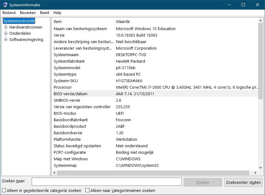 Windows zelf kan je dat vertellen. Druk hiervoor op Windows-toets+R, tik msinfo32 in en druk op Enter. Het venster met Systeeminformatie duikt op. Selecteer hier de rubriek Systeemoverzicht en ga na wat er precies vermeld staat bij BIOS-versie/datum.