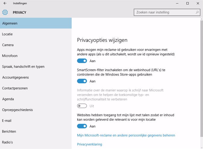 Alles wat met privacy te maken heeft in Windows 10, vind je via Windows-toets+I (Instellingen) / Privacy. Je krijgt een lange lijst te zien met categorieën. We raden aan om de instellingen rustig te bekijken en te wijzigen waar je dat nodig vindt. Begin bij Algemeen. Hier zie je bijvoorbeeld dat apps je reclame-id (een unieke identificatie) mogen gebruiken. De opties zijn met één muisklik uit te schakelen. Lees ook: Stop de Microsoft-spyware in Windows 10.