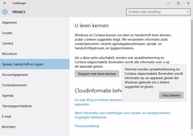 Ook de instellingen bij Spraak, handschrift en typen vragen om je aandacht. Onder het mom van 'we willen je leren kennen om je beter te helpen' worden gegevens over toetsaanslagen, stem en handschrift (dit laatste bijvoorbeeld op tablets) verzameld. Vind je dit geen goed plan? Uitschakelen maar! Bij Accountgegevens kun je apps toestaan om basisinformatie van jou te gebruiken. Dit heeft als voordeel dat je bepaalde gegevens niet meer hoeft op te geven, maar het laat zich raden dat sommige mensen de toegang tot deze informatie liever niet delen met een onbekende app-maker.