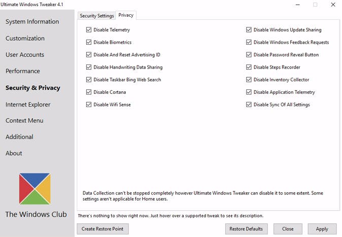 Zo kan het dus ook: Ultimate Windows Tweaker toont alle essentiële privacyinstellingen in een eenvoudig overzicht.