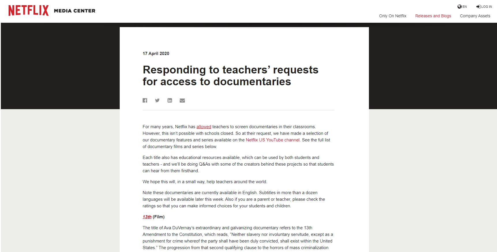 Netflix gaf de afleveringen vooral vrij vanuit educatief oogpunt, bijvoorbeeld voor leraren om te laten zien aan studenten. Op deze manier wil de streamingdienst leraren en scholen ondersteunen tijdens de huidige coronacrisis. Niet iedereen heeft immers een Netflix-abonnement en op deze manier kunnen scholen en leraren toch educatieve series in hun lessen gebruiken. Maar je hoeft uiteraard geen student te zijn om van de series te kunnen genieten.