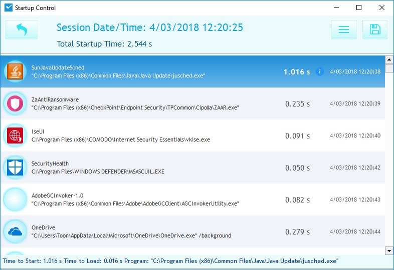 BootRacer bevat tevens een tool om ongewenste autostarters (al dan niet definitief) uit te schakelen en de onderlinge opstartvolgorde te wijzigen. In het hoofdvenster klik je op Startup Control. Om zo’n mee-eter tijdelijk uit te schakelen, verwijder je het vinkje naast het item. Je kunt hem ook permanent verwijderen met de knop Delete, maar dat doe je natuurlijk alleen maar als je zeker van je zaak bent.