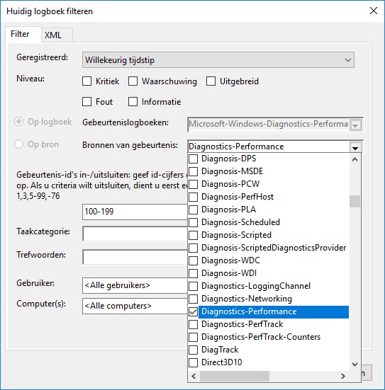 Gevorderde gebruikers zullen wellicht bekend zijn met de functie Logboeken van Windows. Hierin worden de kleinste details bijgehouden van wat er allemaal op je systeem gebeurt … ook van de bootprestaties. Druk op Windows-toets+R en voer eventvwr.msc uit. Open hier achtereenvolgens Logboeken Toepassingen en Services / Microsoft / Windows / Diagnostics-Performance / Operational. De informatie is wat overweldigend, maar je kunt snel inzoomen: klik in het rechterpaneel op Huidig logboek filteren en vul de volgende data in: Diagnostics-Performance (bij Bronnen van gebeurtenis) en 100-199 (bij Gebeurtenis-id’s). Je krijgt nu allerlei feedback over de bootprestaties te zien: klik een item aan meer voor gedetailleerde informatie. Met wat geluk kom je zo te weten welke items voor extra vertraging in het opstartproces zorgen.