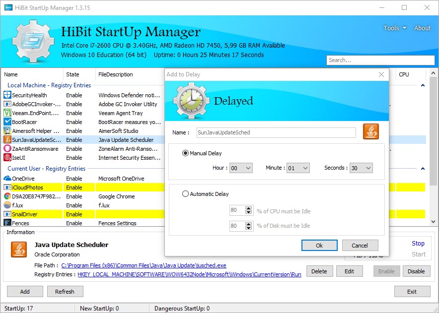 Naast BootRacer is er nog een andere, krachtigere opstartbeheerder, die zich op de wat meer gevorderde gebruiker richt: HiBit StartUp Manager. Download het programma, waarbij je kiest voor de installeerbare versie; in de portable variant ontbreken enkele opties. Ook deze tool geeft je een lijst van alle autostarters, maar vanuit het contextmenu is het onder meer mogelijk via de optie Add to Delay zelf te bepalen of je het inladen van de autostarter bewust wilt uitstellen en zo ja met hoeveel tijd. Op deze manier krijg je dus iets sneller het bureaublad te zien, aangezien het uitgestelde programma pas naderhand wordt opgestart. Via de optie Automatic Delay is het zelfs mogelijk randvoorwaarden voor het uitstel vast te leggen, zoals 80% of CPU must be Idle of 60% of Disk must be Idle.