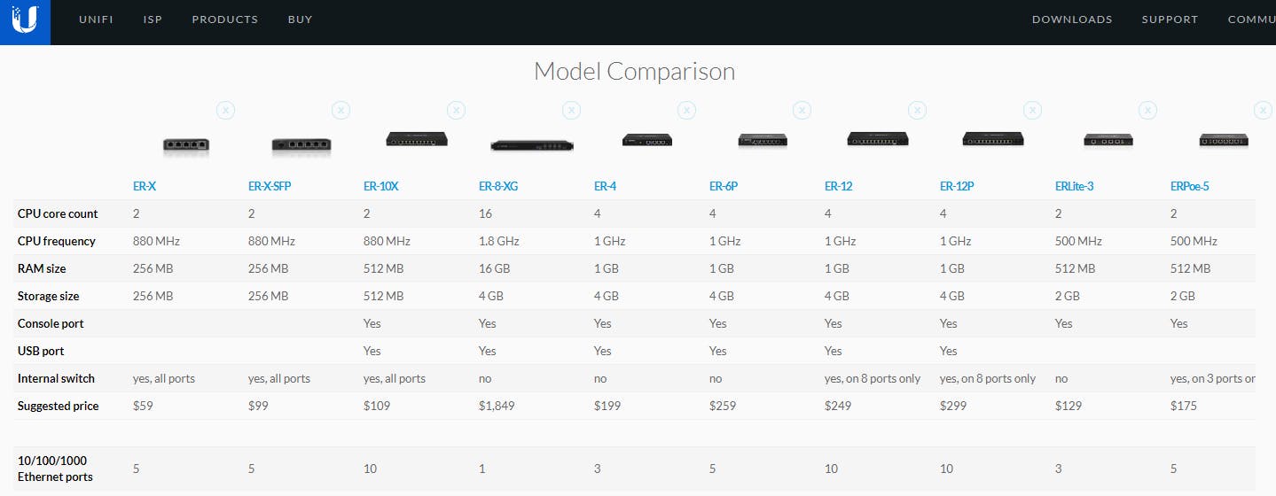 De naamgeving die Ubiquiti aan de EdgeRouters geeft is nogal onnavolgbaar en grotendeels gebaseerd op het aantal poorten. De ER-X, ER-X-SFP en ER-10X bevatten dezelfde cpu en zijn dus even krachtig. Vervolgens bevatten ook de ER-4, ER-6P en ER-12 dezelfde cpu. De ER-12 is een variant van de ER-4 met een ingebouwde hardwareswitch. De ERLite-3 is duurder dan de ER-X, maar voor SQM-toepassingen langzamer.