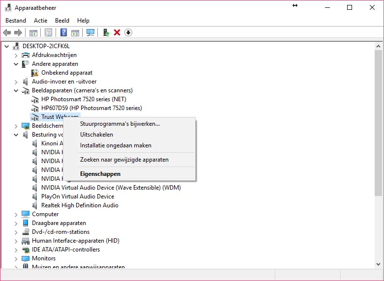 De tweede optie is het uitschakelen van het apparaat via Apparaatbeheer in Windows. Om dit te doen klik je op Start en typ je Apparaatbeheer, waarna je klikt op het gevonden resultaat. Zoek nu naar het kopje Beeldapparaten en daar zou je de webcam moeten staan die je hebt aangesloten. Rechtsklik hierop en klik vervolgens op Uitschakelen. Het apparaat wordt nu uitgeschakeld. Dit is een redelijk veilige methode, maar niet honderd procent. In theorie zou een hacker met voldoende toegang tot je pc het apparaat weer in kunnen schakelen. Zorg daarom dat je altijd een goede virus- en malwarescanner hebt draaien. Ook dat is geen garantie, maar hackers gaan graag voor laaghangend fruit, dus hoe moeilijker je het maakt, hoe beter.