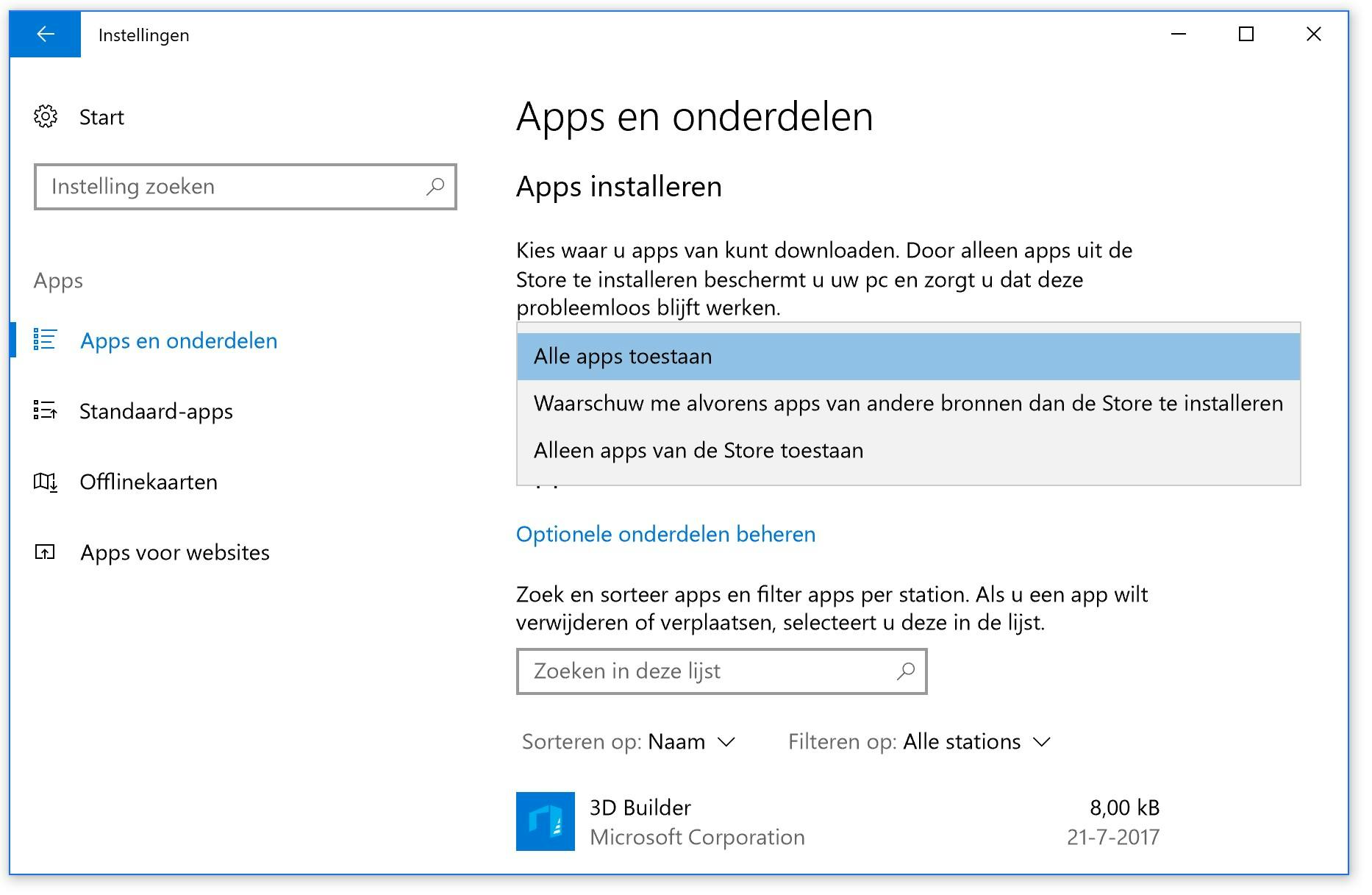 Ga naar Instellingen > Apps > Apps en onderdelen. Onder de header Apps installeren kun je instellen van welke bronnen apps gedownload mogen worden. Er worden drie keuzemogelijkheden geboden.