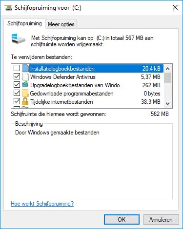 Een van de meest voor de hand liggende manieren om ruimte te winnen is ballast verwijderen door middel van het in Windows ingebouwde programma Schijfopruiming. Open het menu Start, typ Schijfopruiming en klik op OK. Je selecteert de schijf waar je ruimte wilt vrijmaken en daarna vink je de onderdelen aan die weg mogen. Met dit tooltje kun je veilig tijdelijke internetbestanden, offline webpagina’s en logboekbestanden wissen. Ook laat je tijdelijke bestanden verwijderen die een week of langer niet zijn aangesproken. Onderaan staat een tellertje dat aangeeft hoeveel schijfruimte je vrijmaakt. Valt het aantal gewonnen MB’s tegen, dan is er de optie Systeembestanden opschonen, waarmee je onder meer Windows-updates opruimt.