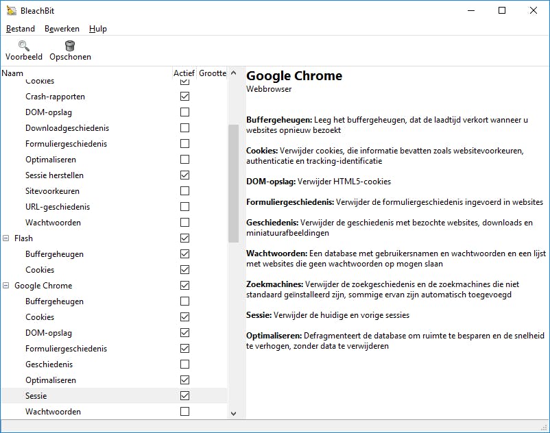 Wil je nog meer ruimte vrijmaken, dan is BleachBit een aanrader. Deze tool om rommel op een computer te verwijderen is vergelijkbaar met CCleaner. Een belangrijk verschil is dat BleachBit opensource is. Het programma werkt ook in het Nederlands. De onderdelen die je kunt schoonmaken zijn verdeeld in categorieën als Systeem, Chrome en Firefox. Wanneer je winapp2.ini in deze tool ophaalt, kan BleachBit de restanten van 2.500 extra programma’s opruimen.