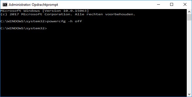Sluimerstand, niet te verwarren met slaapstand, is eigenlijk overbodig als je een ssd hebt. In sluimerstand wordt de pc afgesloten nadat hij de inhoud van het geheugen heeft weggeschreven. Hierdoor kan de pc onmiddellijk doorgaan waar hij gebleven is en dat zorgt met een klassieke harde schijf inderdaad voor scherpere opstarttijden. Met een snelle ssd is die opstartwinst verwaarloosbaar. Door de sluimerstand uit te schakelen win je alweer ruimte. Geef in het zoekvak bij Start de term Opdrachtprompt in en start deze tool met de rechtermuisknop als administrator. Voer het commando powercfg -h off in en druk op Enter om de sluimerstand uit te schakelen.