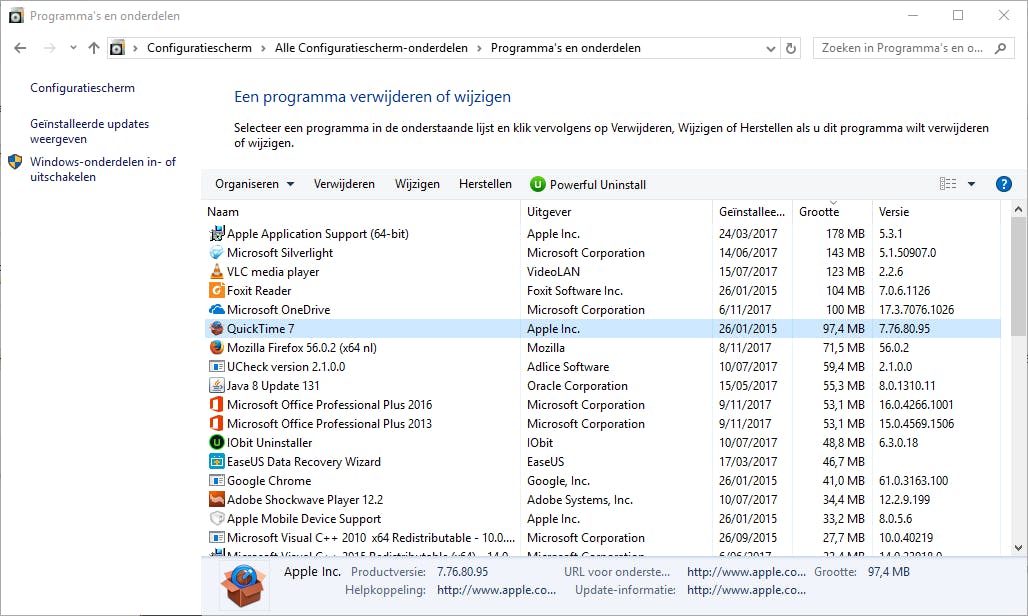 Programma’s wegsmijten die je nooit gebruikt levert uiteraard ook extra ruimte op, maar sommige applicaties nemen nu eenmaal weinig ruimte in beslag. Via het Configuratiescherm en dan Programma’s en onderdelen krijg je zicht op wat er allemaal op de pc is geïnstalleerd. In de kolom Grootte lees je het aantal MB’s dat deze software inneemt. Klik op de titel van de kolom om alle items volgens grootte te sorteren. Met de rechtermuisknop verwijder je de software die je liever kwijt dan rijk bent.