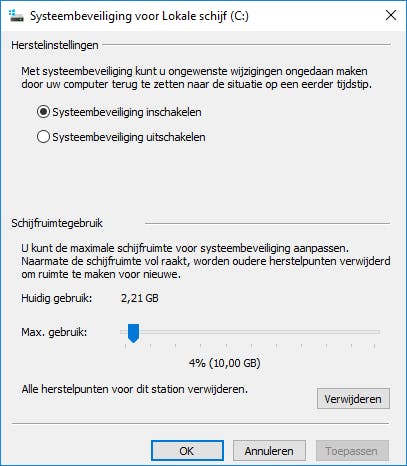 Systeemherstel is een krachtig middel om de computer bij problemen terug te zetten naar een punt in het verleden. Daarvoor neemt Systeemherstel als het ware een foto van hoe je systeem er op dat moment uitziet, maar zo’n herstelpunt heeft geen invloed op je documenten, muziek of afbeeldingen. Het systeem wist automatisch oude herstelpunten, maar hoe meer gigabytes je aan Systeemherstel toestaat, hoe meer herstelpunten het zal bewaren. In het Configuratiescherm klik je op Systeem en daarna open je Systeembeveiliging. In het tabblad Systeembeveiliging klik je op Configureren. Met een schuifregelaar geef je aan hoeveel schijfruimte je bereid bent op te offeren voor deze herstelpunten. Een procent meer of minder vertaalt zich onmiddellijk in gigabytes schijfruimte.