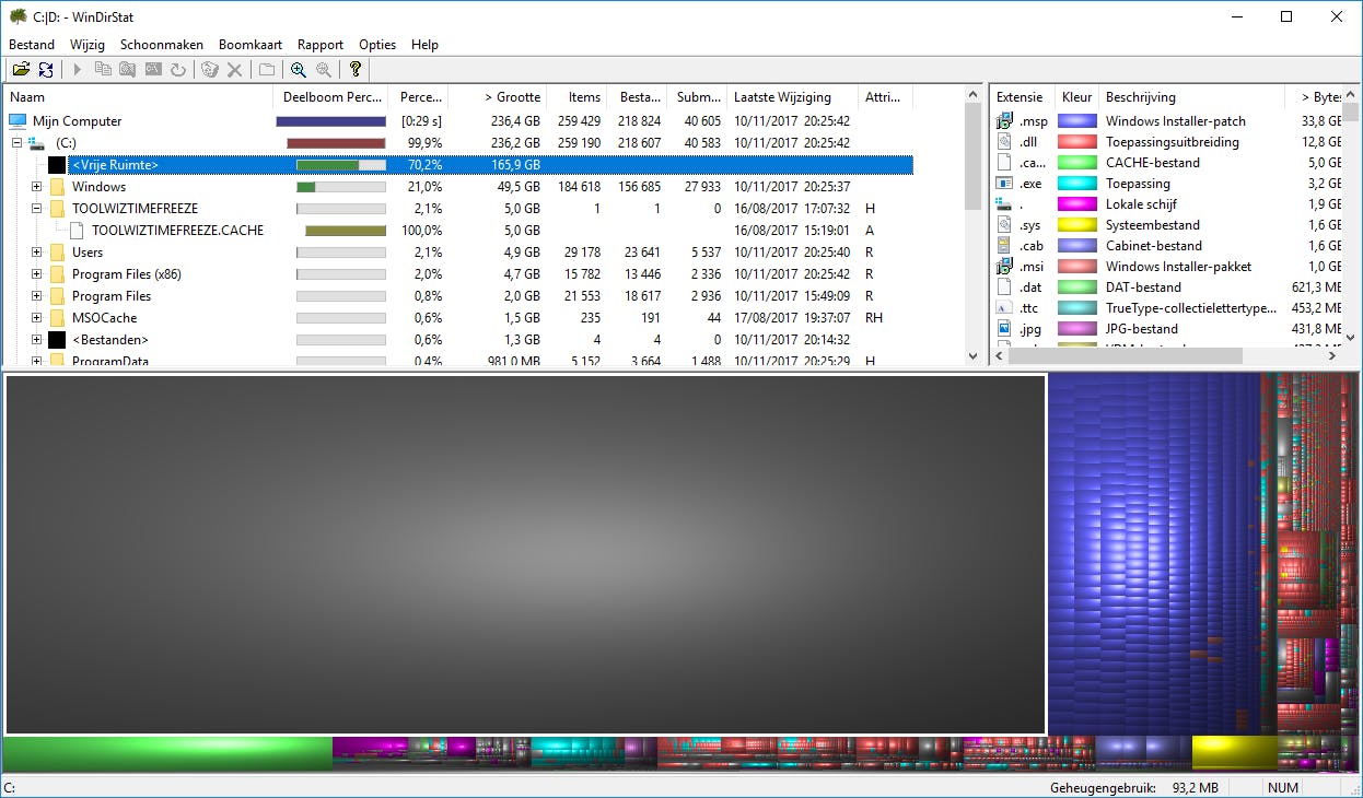 WinDirStat maakt een analyse van de harde schijf zodat je duidelijk ziet hoe je de schijfruimte opslokt. Bij de installatie van deze freeware kun je de Nederlandse taalbestanden inladen, daarna verschijnt een dialoogvenster waarin je aangeeft welke gegevensdrager je wenst door te lichten. Het overzicht is duidelijk en bij elke extensie hoort een kleurtje. Bovenaan kun je navigeren zoals in Windows Verkenner. Terwijl je een map of bestand selecteert, markeert deze freeware de data in het bonte overzicht. Wanneer je met de rechtermuisknop op een bestand of map klikt, kun je de data verwijderen, het pad opvragen, openen in Verkenner of in Opdrachtprompt.