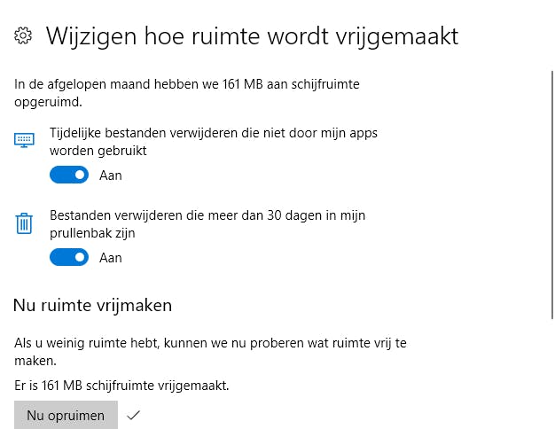 Sinds de Creators Update heeft Windows 10 een functie die automatisch schijfruimte vrijmaakt zonder dat je een hulpprogramma hoeft te openen. De functie heet nogal onlogisch Slim opslaan. Wat ons betreft had het beter ‘Schijfopruiming voor sloddervossen’ kunnen heten. Open via de Instellingen de keuze Systeem en klik dan links op Opslag. Bij de volgende stap geef je aan dat je Slim opslaan wilt inschakelen. Wanneer je klikt op Wijzigen hoe ruimte wordt vrijgemaakt lees je dat deze optie automatisch nutteloze tijdelijke bestanden wist, net als bestanden die meer dan 30 dagen in de prullenmand zitten.