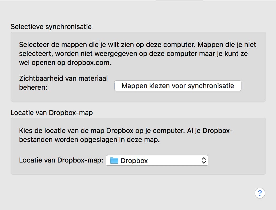 Uiteraard bewaar je ook bestanden en foto’s in de cloud, maar daarmee win je eigenlijk geen schijfruimte omdat alles wat je online bewaart meestal ook wordt gesynchroniseerd met je pc – tenzij je selectief synchroniseert. Dat betekent dat je aangeeft welke mappen de onlinedienst naar je laptop of desktop moet synchroniseren en welke mappen uitsluitend online beschikbaar blijven. Die laatste bestanden kun je dus wel steeds bereiken via het internet. Klik op het Dropbox-pictogram in het systeemvak. Klik dan op het tandwielpictogram en selecteer Voorkeuren. Daarna kom je in het venster om de Selectieve synchronisatie in te stellen.