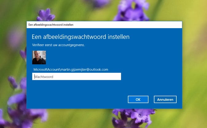 Klik op Start en vervolgens op Instellingen / Accounts. Klik op het tabblad Aanmeldingsopties en scrol naar beneden naar het kopje Afbeeldingswachtwoord. Klik op Toevoegen, waarna je de vraag krijgt om het wachtwoord van je Microsoft-account in te vullen. Klik op OK en vervolgens op Afbeelding kiezen, om vervolgens de gewenste foto of afbeelding te kiezen (denk aan de herkenningspunten). Nu dien je drie gebaren te tekenen op de foto, die je daarna moet herhalen. Als je dit hebt gedaan, is dit de manier waarop je voortaan inlogt.