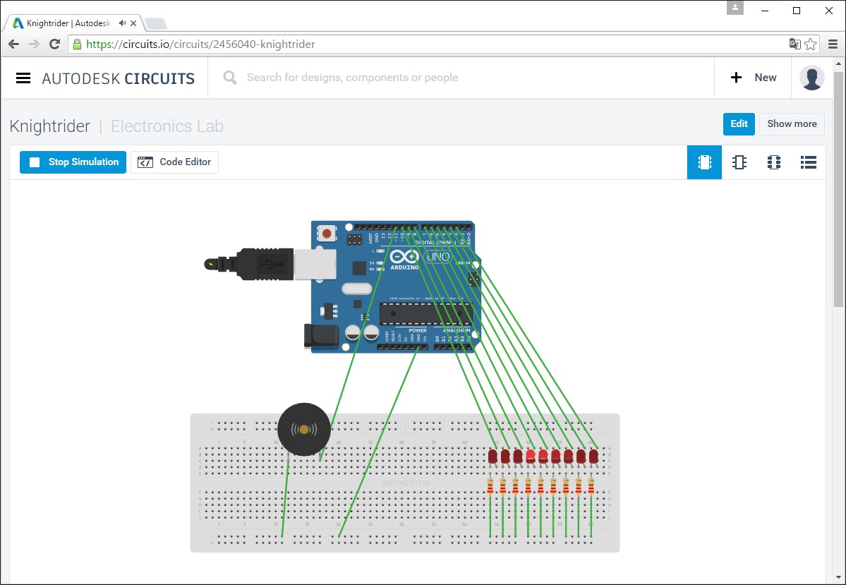 Je kunt de emulator gebruiken om een schakeling te bouwen en je code te testen zonder dat je daarvoor een echte Arduino nodig hebt. Je kunt op deze manier ook alvast werken met componenten die je nog niet hebt en uitproberen of wat jij wilt maken mogelijk is. Ook kun je de emulator gebruiken om te troubleshooten. Doet je project niet wat jij wilt, dan kun je in de emulator je schakeling nabouwen en controleren of je code wel echt doet wat hij moet doen. Vertoont de emulator hetzelfde onverwachte gedrag als je echte Arduino, dan is de kans groot dat het probleem in de code zit, en niet in de schakeling.