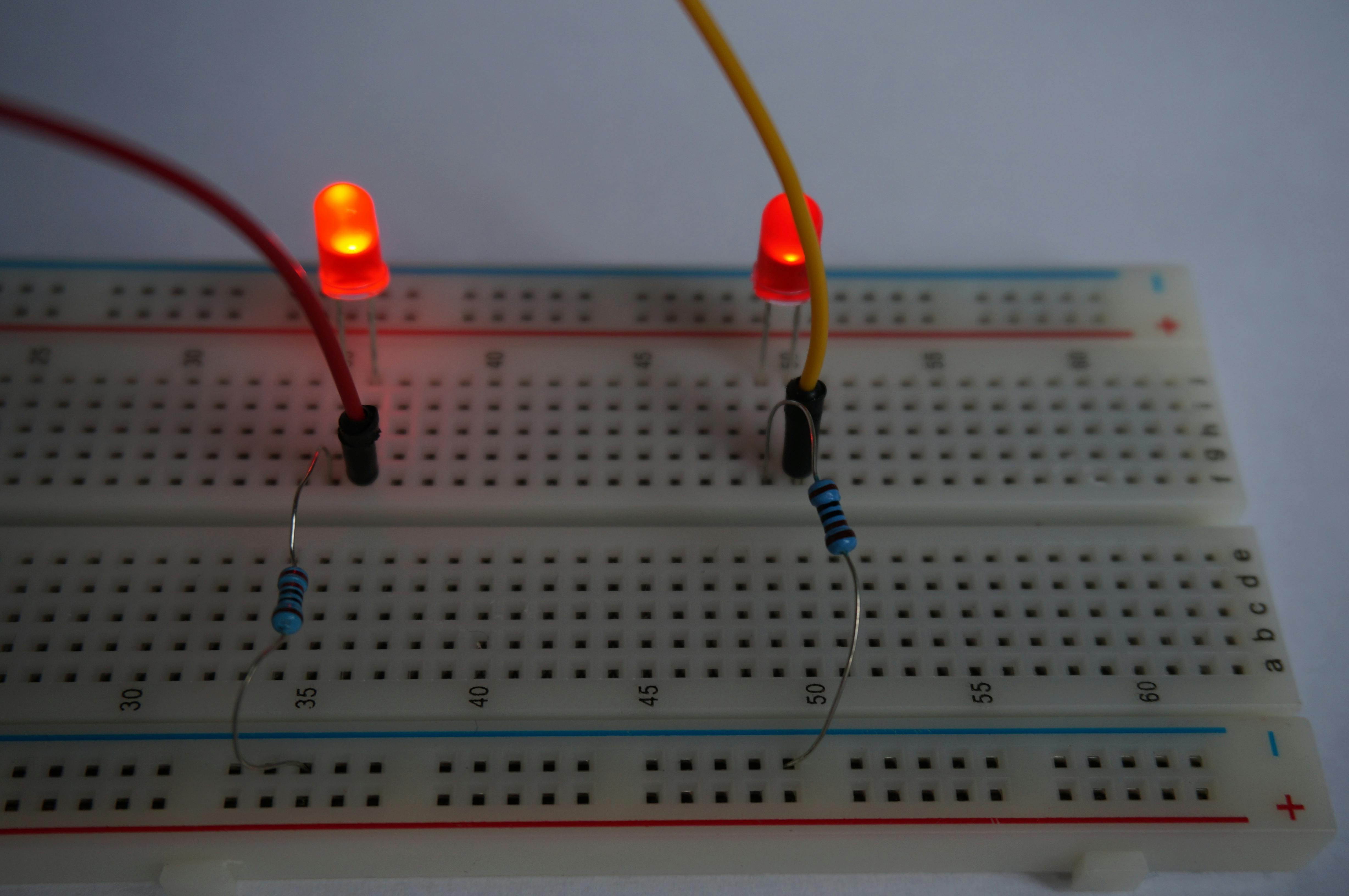 Een belangrijke basisregel bij het werken met je Arduino en leds is dat je een weerstand gebruikt bij het aansluiten van een led. Zo voorkom je dat de led doorbrandt. In veel gevallen wordt een weerstand van zo’n 220 ohm aangeraden, deze waarde is eigenlijk altijd veilig. Maar wat als je deze waarde niet hebt? Besluit in ieder geval niet om de weerstand dan maar helemaal weg te laten. Je led zal even heel fel branden, om vervolgens nooit meer aan te gaan. Zeker bij leds kun je ervan uitgaan dat je altijd een hogere weerstand kunt gebruiken. Het is dus geen probleem om bijvoorbeeld een weerstand van 330 ohm te gebruiken.