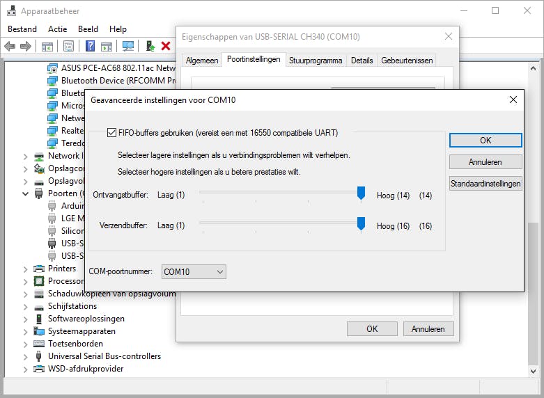 Het zal niet vaak voorkomen, maar soms worden verbindingsproblemen veroorzaakt doordat Windows de virtuele seriële poort COM10 of hoger heeft toegekend aan je Arduino. Meestal werkt dit, maar soms gaat dit niet goed en kun je de Arduino niet in de Arduino-software vinden. Windows zal altijd een zo laag mogelijk poortnummer toekennen, dus het probleem speelt alleen als je al andere apparatuur (hebt) gebruikt waaraan een virtuele seriële poort is toegewezen.